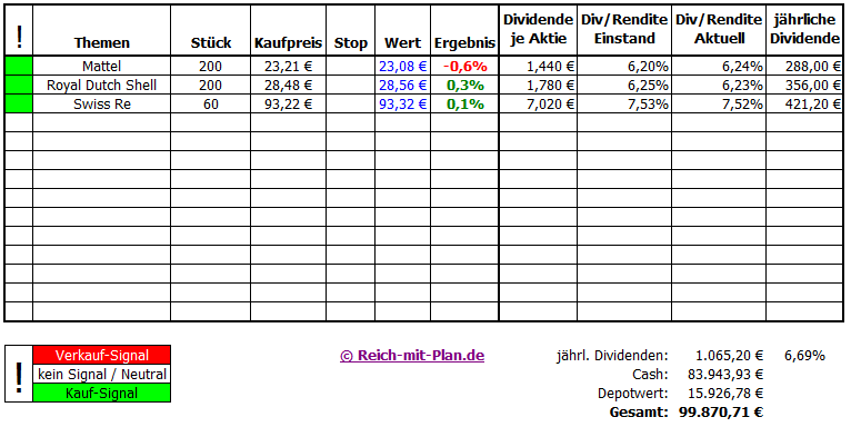 Eine feste Positionsgröße wird es nicht geben. Vielmehr entscheide ich dies je nach Situation der jeweiligen Aktie. Je besser sich das Investment entwickelt, desto mehr würde ich auch investieren. Meine ersten Käufe sind bereits im Depot gelandet. Es handelt sich um Mattel, Royal Dutch Shell und Swiss Re.