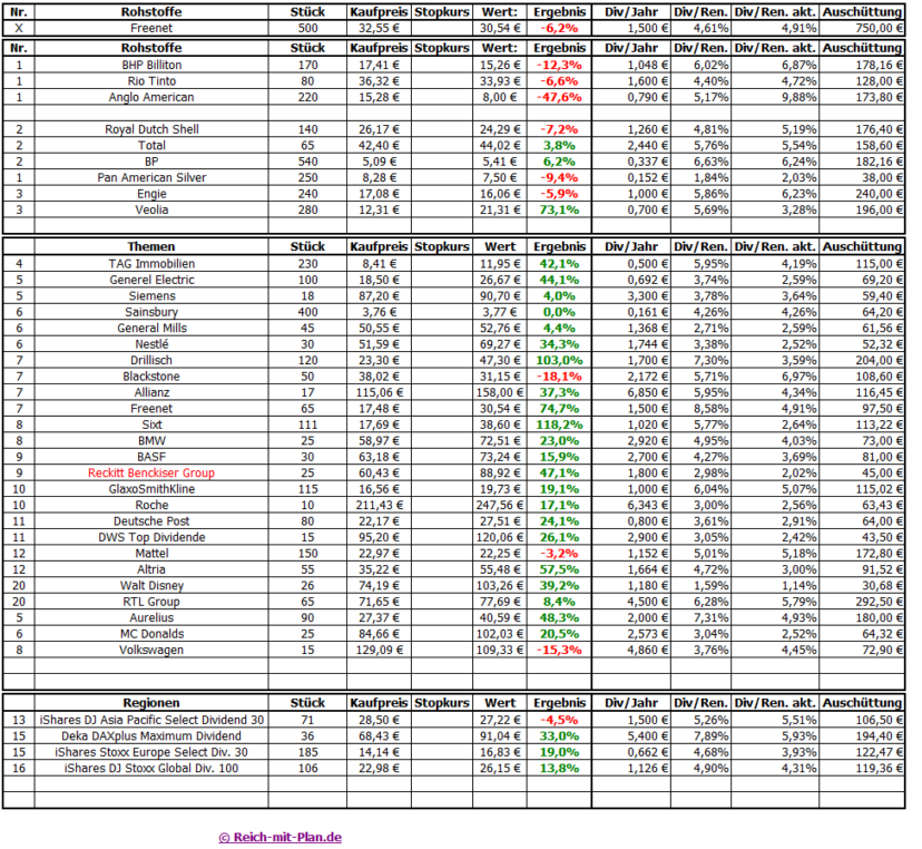 Meine selbst gesetzte jährliche Ziel-Rendite von 8% pro Jahr konnte ich damit mehr als verdoppeln. Das ist doch mal ordentlich für ein Dividenden-Depot mit einer kleinen Trading-Note. Das sehr gute Ergebnis freut mich um so mehr, da die letzten Monate eher schwach waren und ich auch mit meinen Tradingpositionen nicht immer ein glückliches Händchen hatte. Mit Drillisch und Sixt liegen nun bereits zwei Depotwerte über der 100% Marke. Im Moment ist ein Verkauf der beiden noch nicht vorgesehen.[/styled_box] [quote_center]Du möchtest nur für einige deiner Aktien den Dividenden-Alarm nutzen? Dann wird dir dieses Angebot besser gefallen.[/quote_center] [styled_box title=“Tradingposition:“ class=“sb_yellow“] Auch meine langfristige Tradingposition Freenet hat sich zuletzt wieder deutlich erholt. Besonders wichtige News gab es in den letzten Tagen nicht. Dafür rückt in wenigen Tagen das 3-Monatshoch in den Fokus und im Anschluss das Jahreshoch.