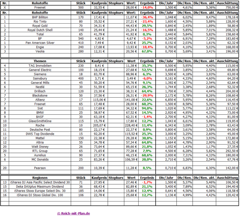 Eine starke Erholung ist auch in diesem Musterdepot zu verzeichnen. Ganz 7,6% konnte das Depot zulegen. Noch so einen Monat und das Depot ist bereits wieder im positiven Bereich. Bis zur Jahresabrechnung Ende Oktober ist aber noch einige Zeit hin. Zu beklagen gab es leider ein paar Dividendenabsenkungen. Swiss Re zahlt keine Sonderdividende mehr, Aurelius zahlt eine deutlich geringere Sonderdividende und Rio Tinto, BHP Billiton sowie Engie haben ihre Dividenden gekürzt. Ärgerlich, aber die Renditen sind hier immer noch attraktiv. Verkauft habe ich die Volkswagen Aktien, nachdem mir das ewige hin und her beim Abgasskandal auf die Nerven geht. Eine ganz so reine Weste hat der Konzern dann wohl doch nicht. Aufgestockt habe ich die Pearson Aktien, nachdem sie sich seit dem Kauf sehr gut entwickelt haben und der Vorstand die Dividende bestätigt hat.[/styled_box]