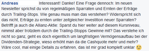 Auf der Facebook-Seite des Dividenden-Alarms hat Andreas eine interessante Frage zum Artikel Rückblick und Aussichten der Allianz Dividende gepostet. Auch wenn Andreas seine Antwort bereits erhalten hat, so möchte ich sie an dieser Stelle allen Lesern zur Verfügung stellen. Die Antwort habe ich etwas gekürzt und für den Blog aufbereitet.