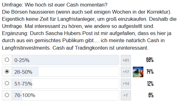 In der letzten Woche habe ich euch gefragt, wie hoch eure Cash-Position aktuell steht. Einige haben mir zwar schon ihre Werte geschickt, aber für eine aussagekräftige Auswertung sind es leider noch zu wenig. Umso interessanter ist eine Umfrage die ich in der Facebook-Gruppe AktienTipp gefunden habe. Hier haben bereits über hundert Teilnehmer mitgemacht und liefern so ein sehr gutes Bild über ihre aktuellen Cash-Reserven.