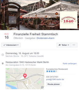 Dazu gibt es nun häufiger die Möglichkeit mich und uns persönlich zu treffen. Neben individuell vereinbarten Treffen, gibt es zum Beispiel in der kommenden Woche einen Stammtisch in Berlin zum Thema Finanzielle Freiheit. Organisiert wird dieses Treffen von meinem Blogger-Kollegen Lars Hattwig. Anfang September wird es dann in Leipzig ein Unternehmer-Meetup geben. Ort und Zeit sind noch offen, wer aber Interesse hätte, sich zu unternehmerischen Themen auszutauschen, der ist herzlich eingeladen und kann mich gern schon im Vorfeld anschreiben.