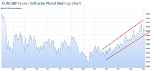Als nächstes stehen bei mir allgemein Aktien aus Großbritannien im Fokus, eben wegen der genannten Brexit Thematik. Dazu möchte ich noch kurz den Chart des britischen Pfunds zeigen. Auch hier ist der Beginn des Trends im Mai dieses Jahres, mit Ausbruch über die in den Monaten zuvor verlaufene Seitwärtsphase, gut zu erkennen.