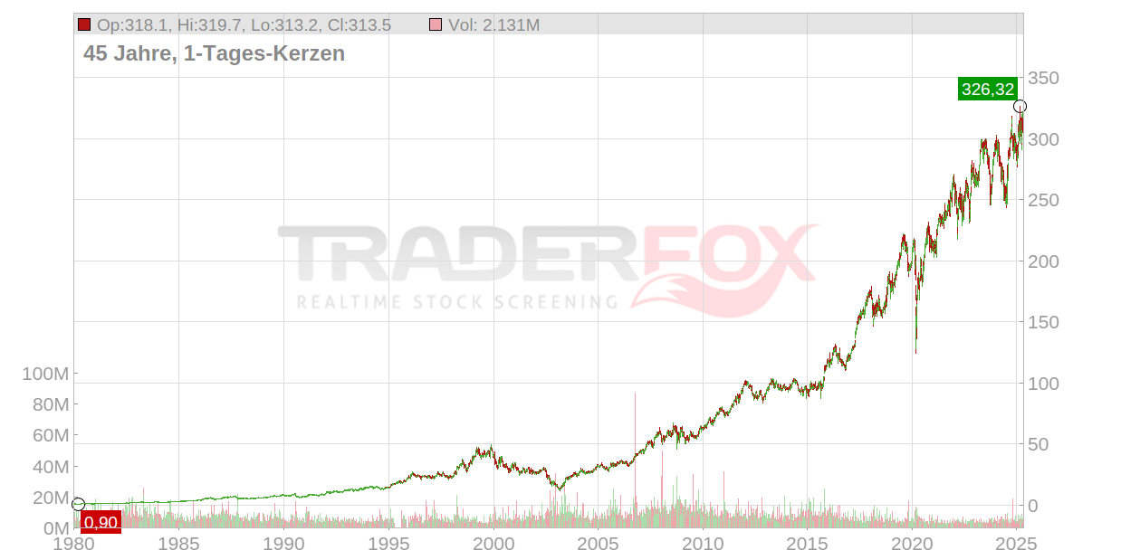 Im Jahr 2019 wurden gut 21 Milliarden USD umgesetzt und damit ein Gewinn von fast 6,4 Mrd. USD erzielt. Die Nettogewinnmarge liegt somit auf einem Rekordwert von 28,6%! Der langfristige Aktien Chart zeigt den Erfolg auch sehr eindrucksvoll. Nicht zu vergessen: die jährlich steigenden Dividenden. Bei einer aktuellen Payout-Ratio von ca. 60% steht einem weiteren Dividendenwachstum nichts im Weg.