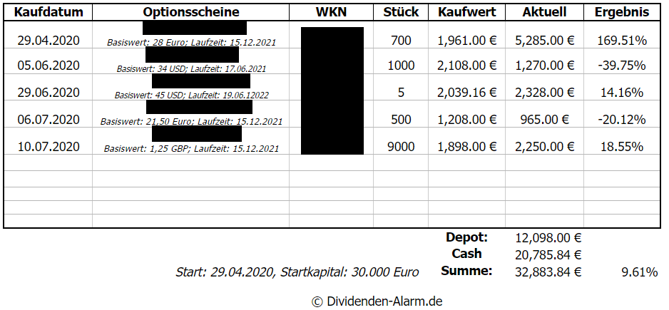 Ende April habe ich meinen ersten Optionsschein gekauft und das Realgeld-Depot ist somit live gegangen. Heute, zweieinhalb Monate später habe ich bereits ein Drittel des zur Verfügung stehenden Kapitals in 5 langlaufende Optionsscheine investiert. Die Performance mit Blick auf das Gesamtkapital (inkl. des nicht eingesetzten Cashs) liegt derzeit bei knapp 10%. Betrachtet man nur das investierte Kapital, dann liegt die Performance bei 31%.