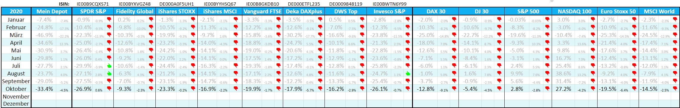 Der Oktober brachte den zweiten Lockdown und damit erneut einen Abverkauf der Märkte. Allen voran den europäischen Börsen. Mein Depot fiel zurück auf -33%. Aufholjagd sieht anders aus und man muss sich den Gegebenheiten fast schon ergeben. Dabei sah die Erholung bis auf die letzten Tage schon sehr solide aus. Das Jahr kann getrost abgehakt werden auch wenn die ersten Novembertage bereits den Oktoberverlust aufgeholt haben. Dafür kommen nach und nach die Dividenden wieder zurück. Bis Ende des kommenden Jahres dürfte ich mein Niveau vor Corona wieder erreicht haben.