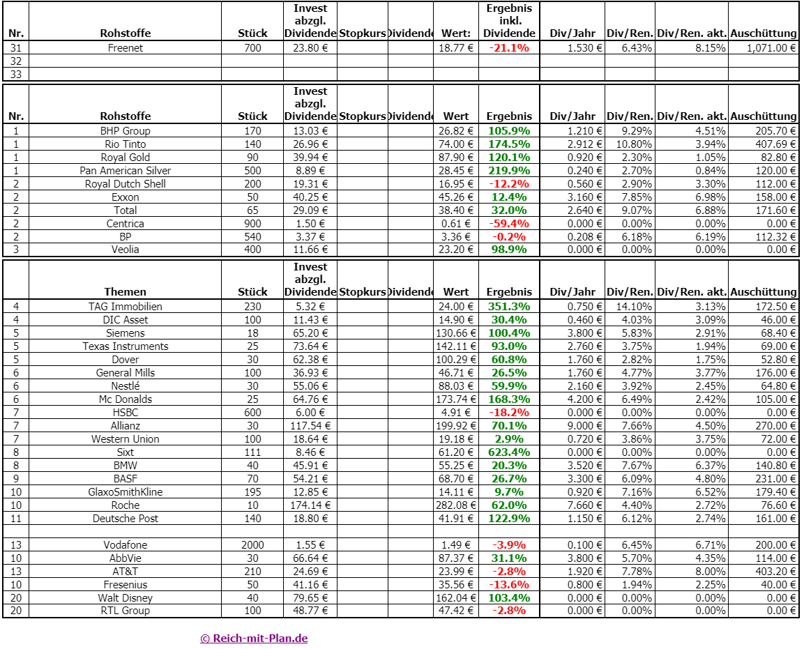 Hinweis: In der Auswertung werden aus organisatorischen Gründen alle Dividenden vom Einstandskurs abgezogen. So muss keine separate Auswertung erstellt werden und wir können zudem auf einen Blick sehen, wie viel investiertes Kapital noch in einer Position steckt und wie sie sich während der gesamten Laufzeit (inkl. Kurs und Dividende) entwickelt hat. In Zukunft bei neu aufgenommenen Werten, werde ich diese Darstellung anpassen.
