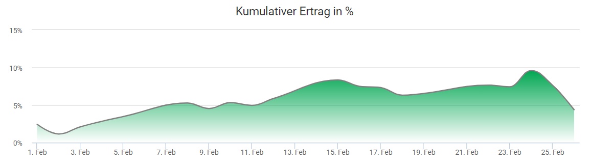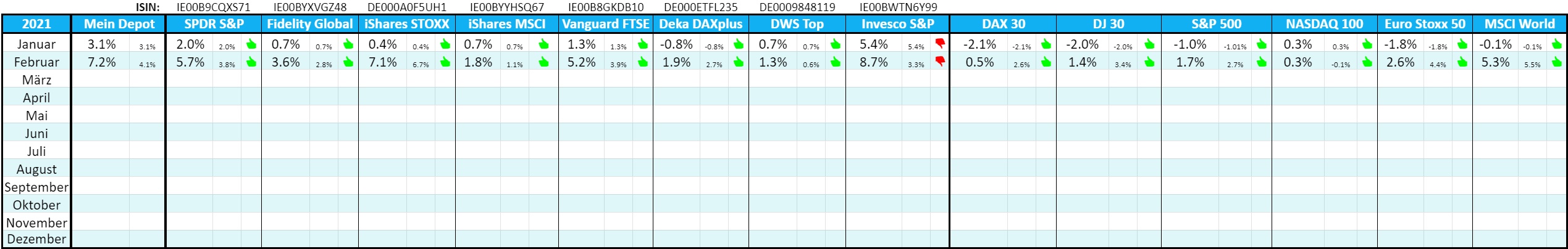 Ein weiterer Monat mit einem sehr guten Ergebnis. Auch im Februar konnte mein Depot überzeugen. Weiterhin bin ich insgesamt unter den Top 3. Auf Monatssicht waren zwei Indizes besser wie meine Performance und zwei Dividenden-ETFs waren sehr knapp an meinem Ergebnis dran. Ich kann daher mehr als zufrieden sein mit meinem Ergebnis, zumal ich auch noch ein wenig aus dem Vorjahr aufholen muss.