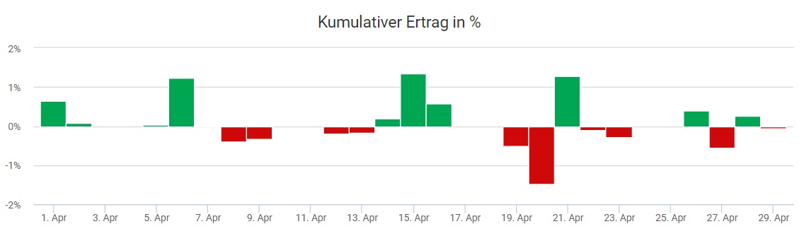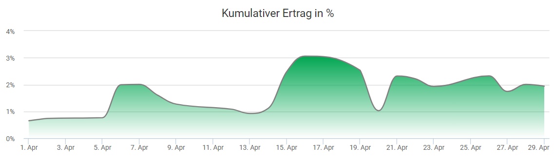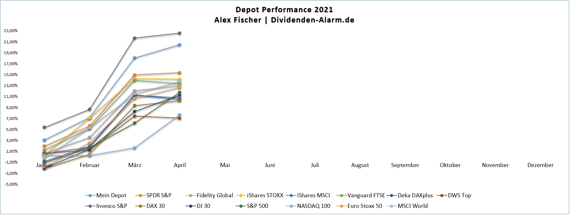 Der April schließt auch mit einem positiven Ergebnis ab, wenn auch die Dynamik der ersten drei Monate stark nachgelassen hat. In den ersten vier Monaten konnte ich aktuell +20,5% einsammeln, womit ich wirklich zufrieden bin. Damit liege ich weiterhin auf dem 2. Platz hinter dem sehr gut laufenden Invesco S&P. Mein Ergebnis ist weiterhin doppelt so hoch wie das des DAX, was mich an das Jahr 2019 erinnert.Da nun die Dividendensaison beginnt, stehen mehr die Ausschüttungen im Fokus, als weitere Kursgewinne.