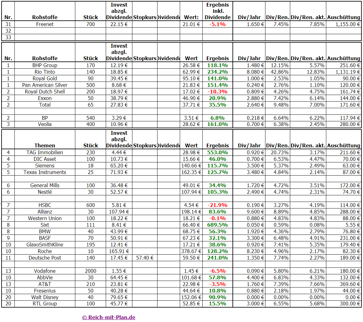 Hinweis: In der Auswertung werden aus organisatorischen Gründen alle Dividenden vom Einstandskurs abgezogen. So muss keine separate Auswertung erstellt werden und wir können zudem auf einen Blick sehen, wie viel investiertes Kapital noch in einer Position steckt und wie sie sich während der gesamten Laufzeit (inkl. Kurs und Dividende) entwickelt hat. In Zukunft bei neu aufgenommenen Werten, werde ich diese Darstellung anpassen.