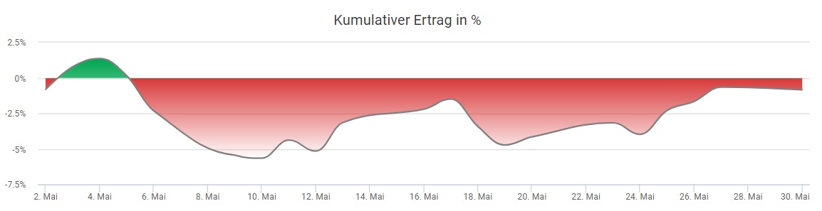 Der Mai startete grottenschlecht und mein Depot verlor in der Spitze bereits mehr als -5%. Im weiteren Verlauf des Monats konnte ich aber den Großteil dieser Verluste wieder aufholen und am Ende blieb ein Ergebnis von -0,97% übrig. Womit ich absolut zufrieden bin. Keine Frage. Ein ähnliches Bild haben wir übrigens im April gesehen, mit dem Unterschied, dass mein Depot am Ende noch knapp ins Plus drehte.