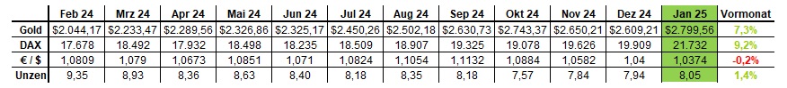 In diesem monatlich erscheinenden Artikel, aus der Blog-Kategorie Gold & Silber, erfolgt die Auswertung der Strategie: Goldpreis in Euro DAX Bewertung für den Monat Januar 2025. Neben den Veränderungen der einzelnen Werte zum Vormonat, wird die Entwicklung der benötigten Unzen Gold in Euro für den DAX anhand von drei Charts (Langzeitchart, Jahreschart, Monatschart) dargestellt.