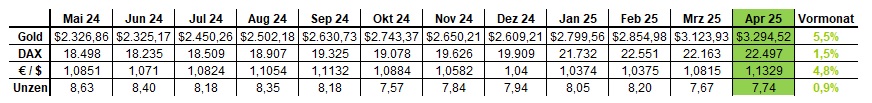 In diesem monatlich erscheinenden Artikel, aus der Blog-Kategorie Gold & Silber, erfolgt die Auswertung der Strategie: Goldpreis in Euro DAX Bewertung für den Monat April 2025. Neben den Veränderungen der einzelnen Werte zum Vormonat, wird die Entwicklung der benötigten Unzen Gold in Euro für den DAX anhand von drei Charts (Langzeitchart, Jahreschart, Monatschart) dargestellt.