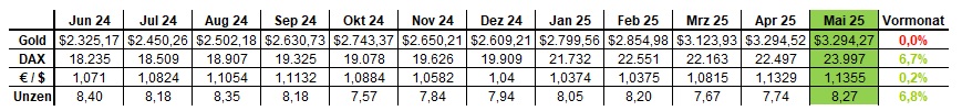 Strategie: Goldpreis in Euro - Mai 2025In diesem monatlich erscheinenden Artikel, aus der Blog-Kategorie Gold & Silber, erfolgt die Auswertung der Strategie: Goldpreis in Euro DAX Bewertung für den Monat Mai 2025. Neben den Veränderungen der einzelnen Werte zum Vormonat, wird die Entwicklung der benötigten Unzen Gold in Euro für den DAX anhand von drei Charts (Langzeitchart, Jahreschart, Monatschart) dargestellt.