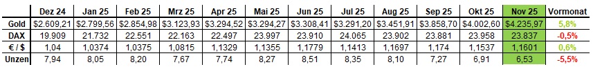 In diesem monatlich erscheinenden Artikel, aus der Blog-Kategorie Gold & Silber, erfolgt die Auswertung der Strategie: Goldpreis in Euro DAX Bewertung für den Monat November 2025. Neben den Veränderungen der einzelnen Werte zum Vormonat, wird die Entwicklung der benötigten Unzen Gold in Euro für den DAX anhand von drei Charts (Langzeitchart, Jahreschart, Monatschart) dargestellt.